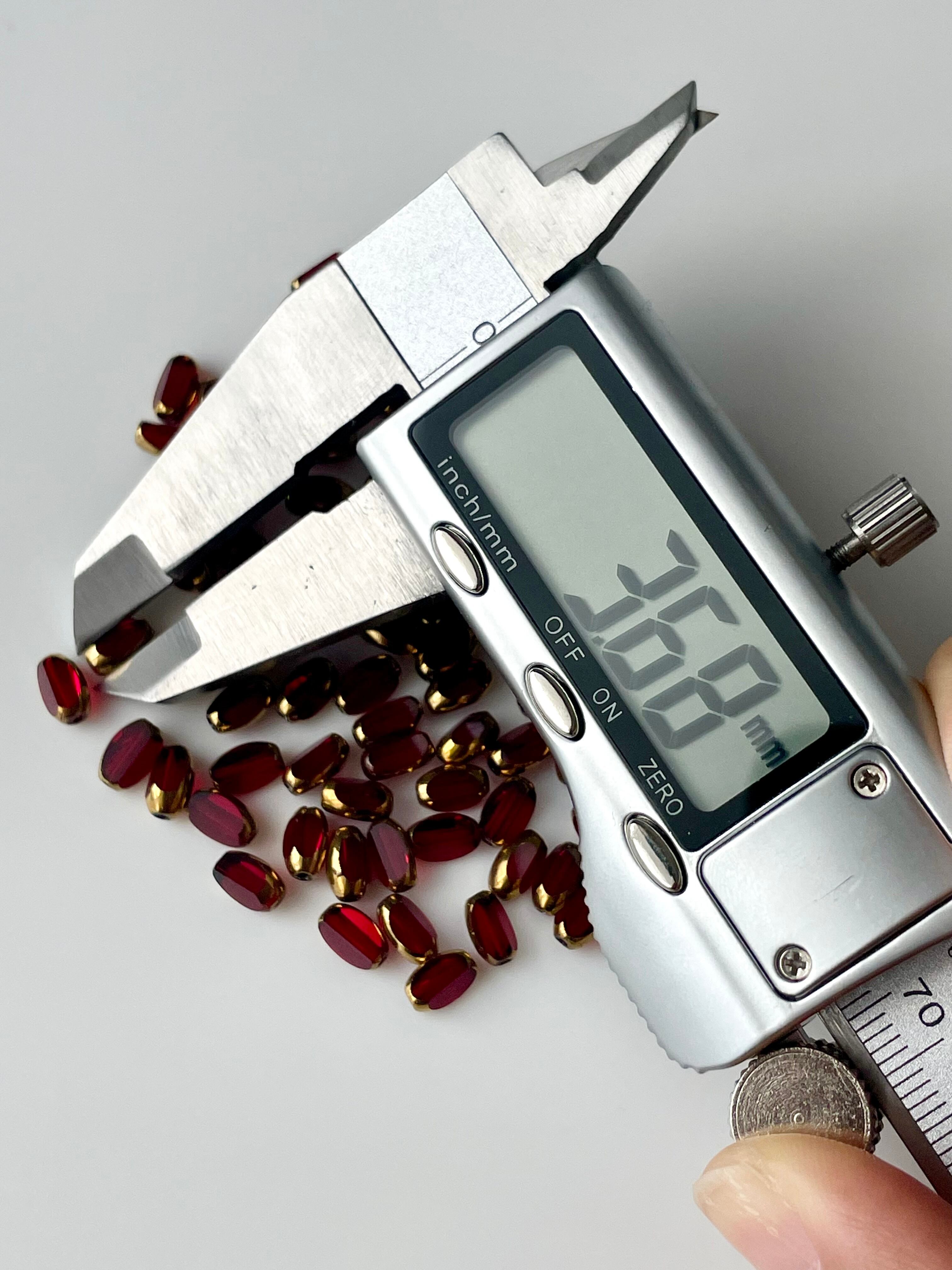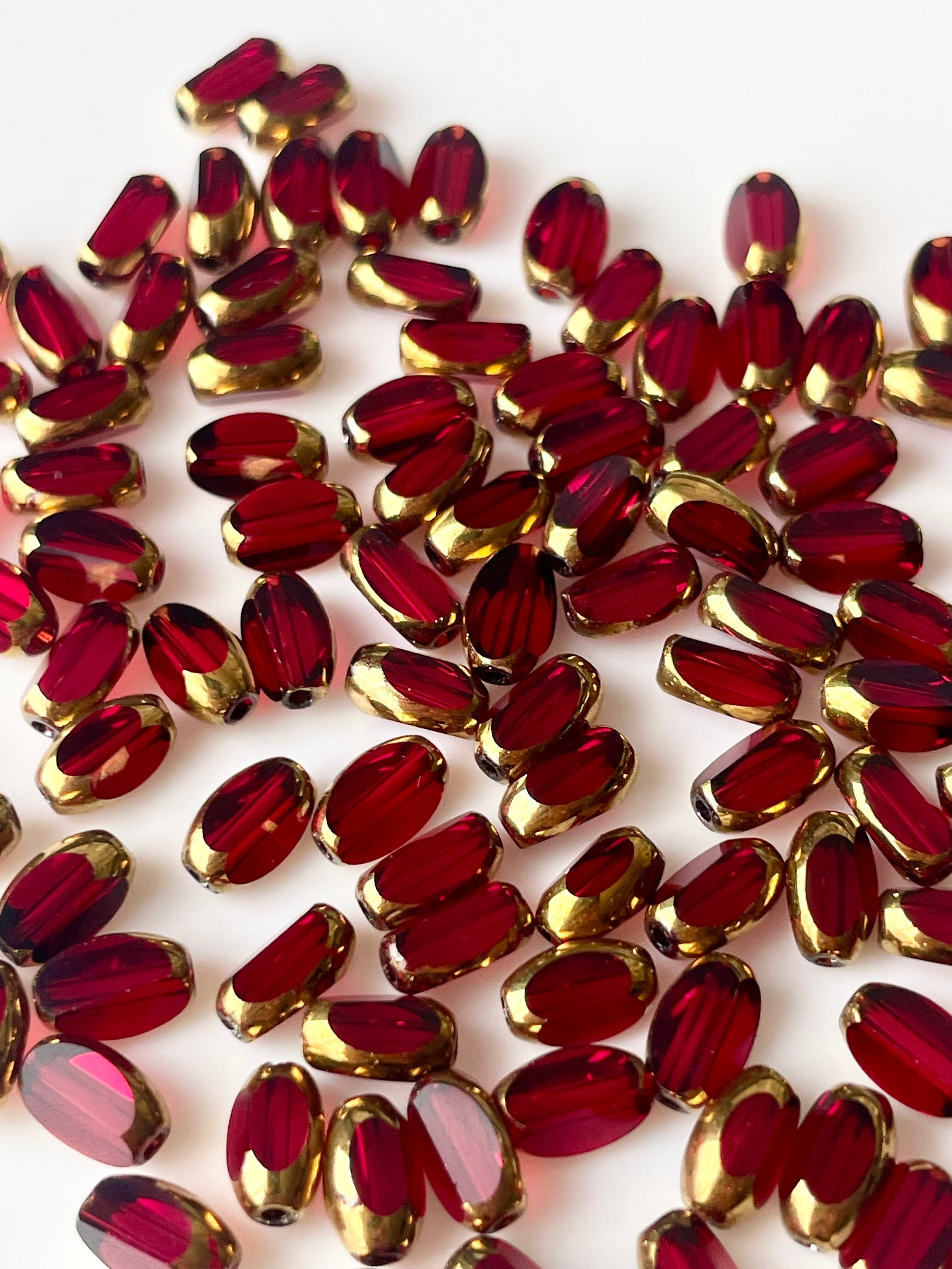 深みのあるレッドにゴールドのアクセントが映える、カット入りオーバル型ガラスビーズ。