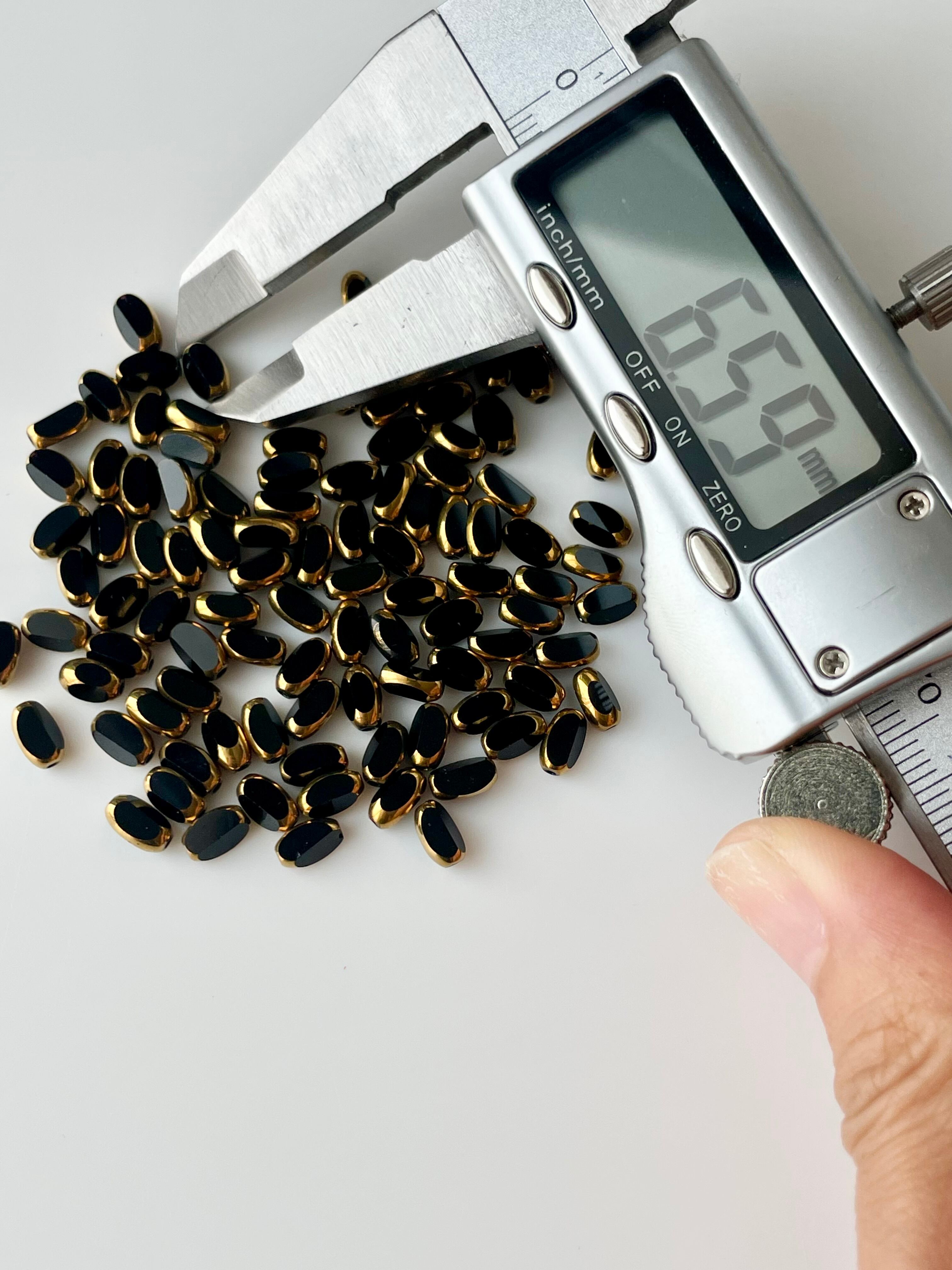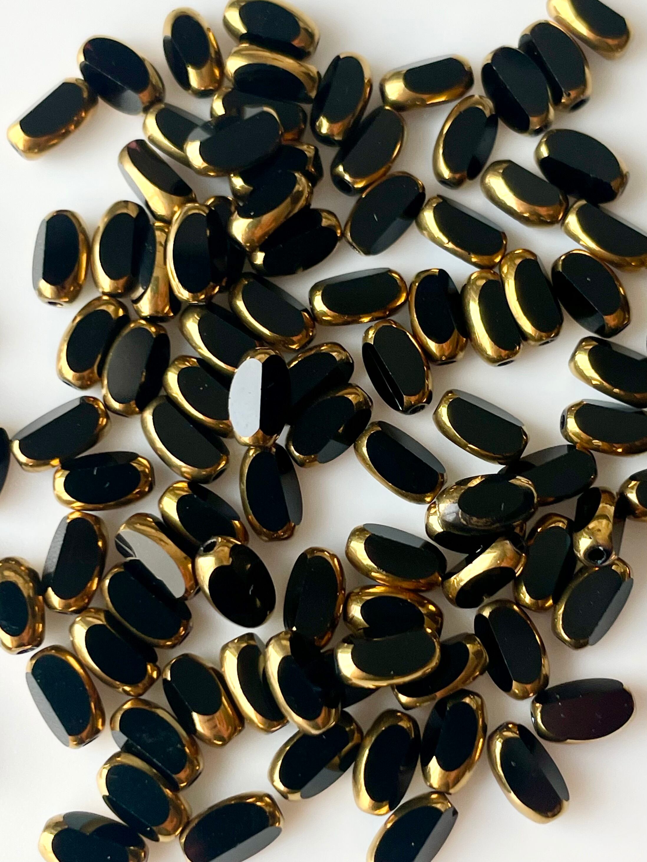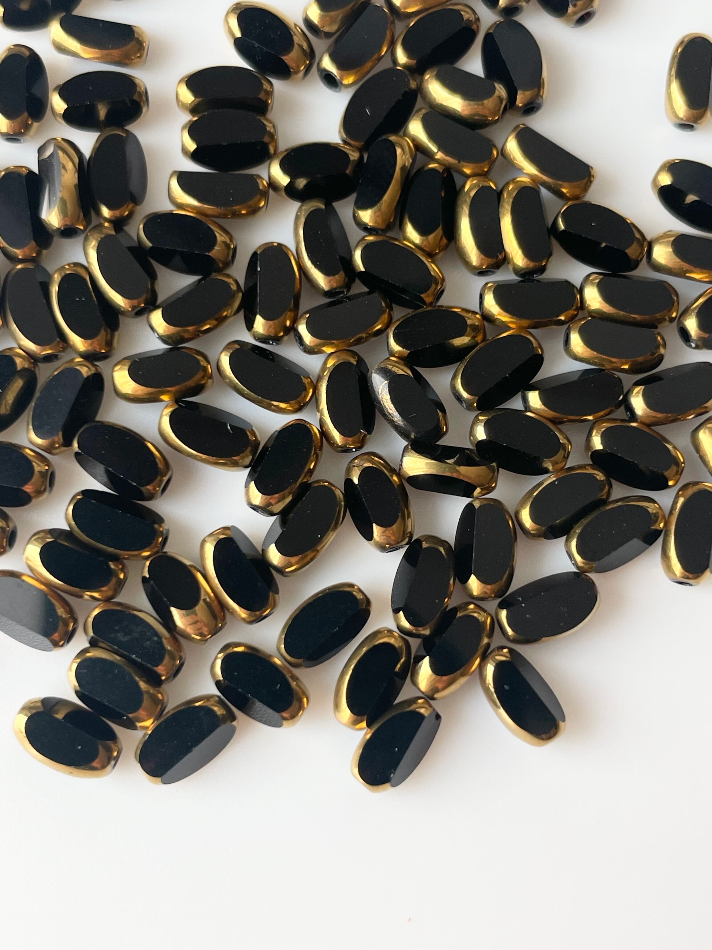 シックなブラックが印象的な、カット入りオーバル型ガラスビーズ。