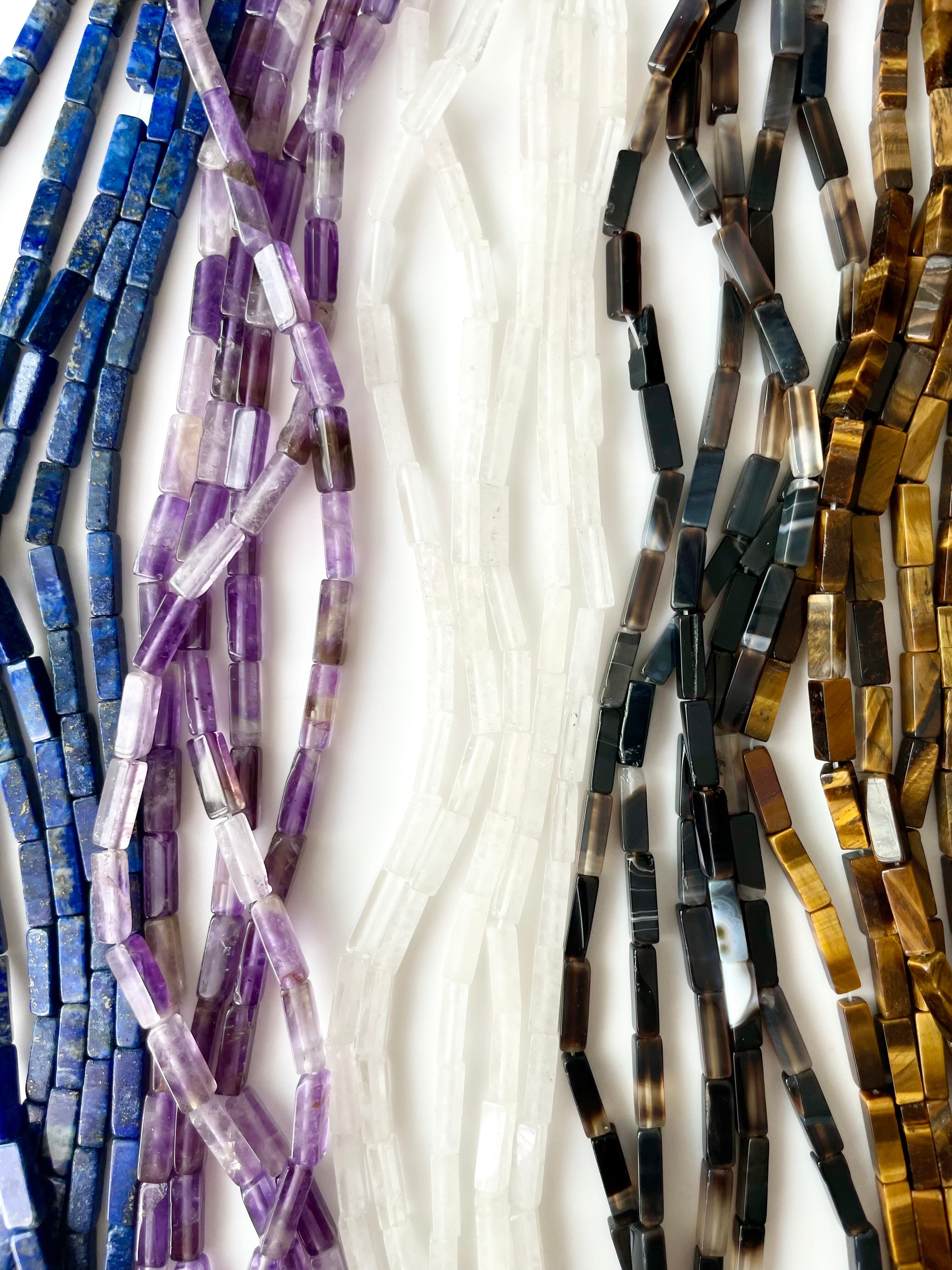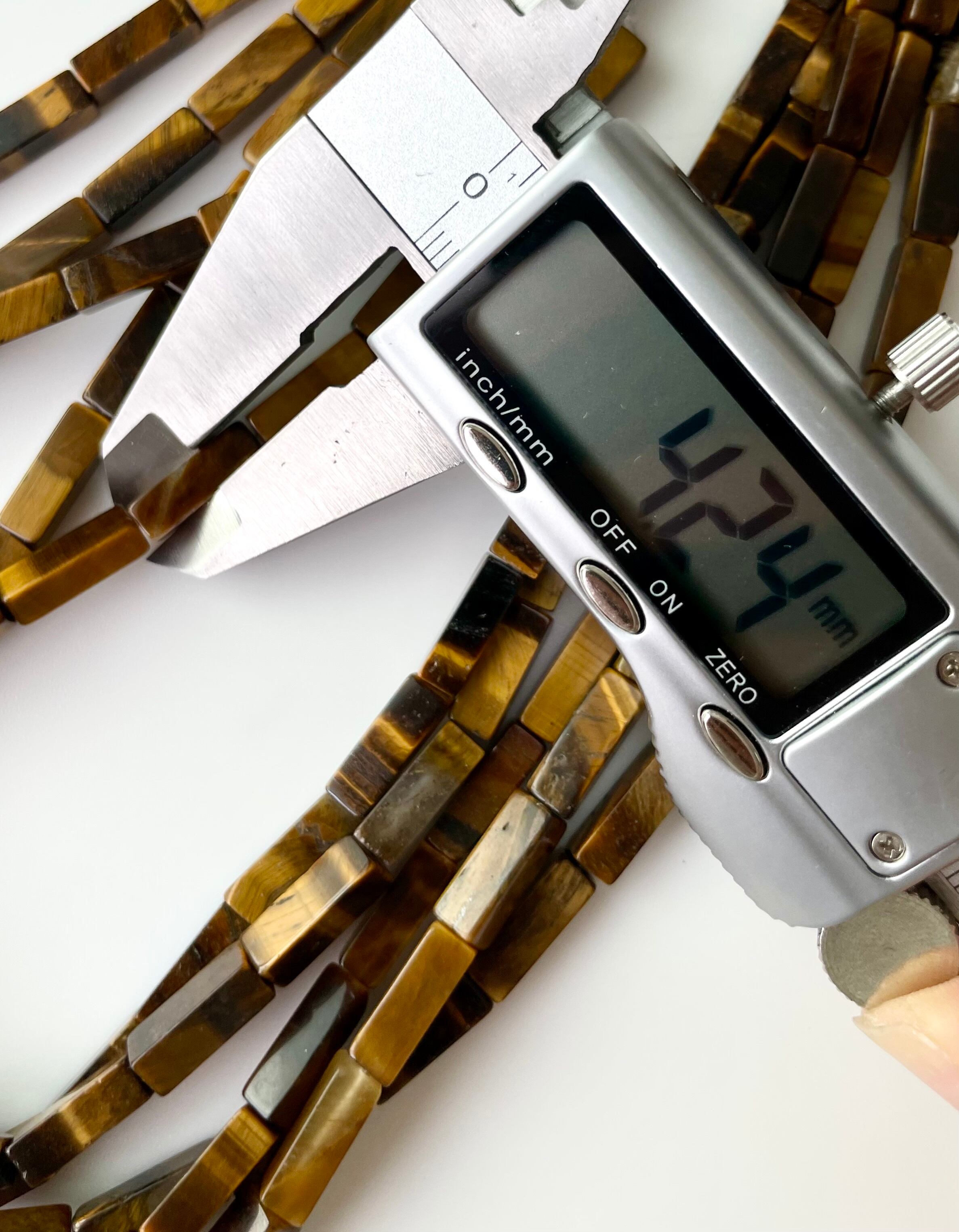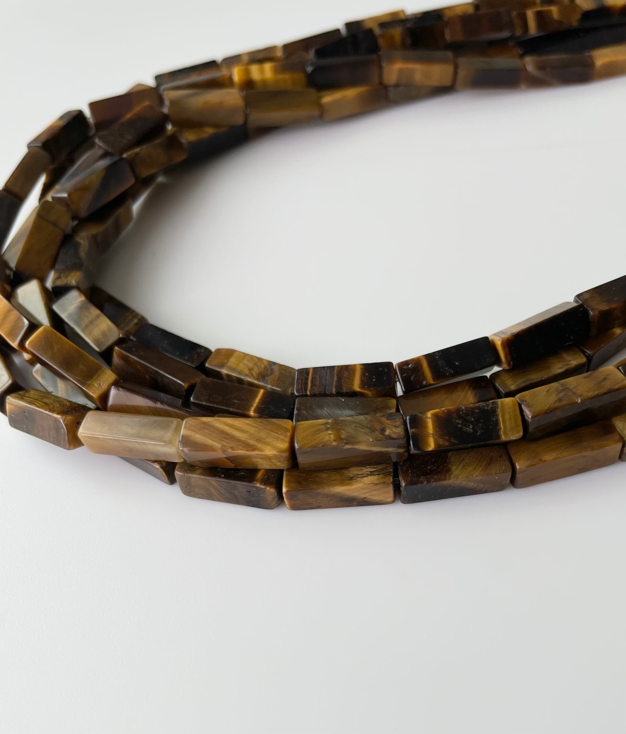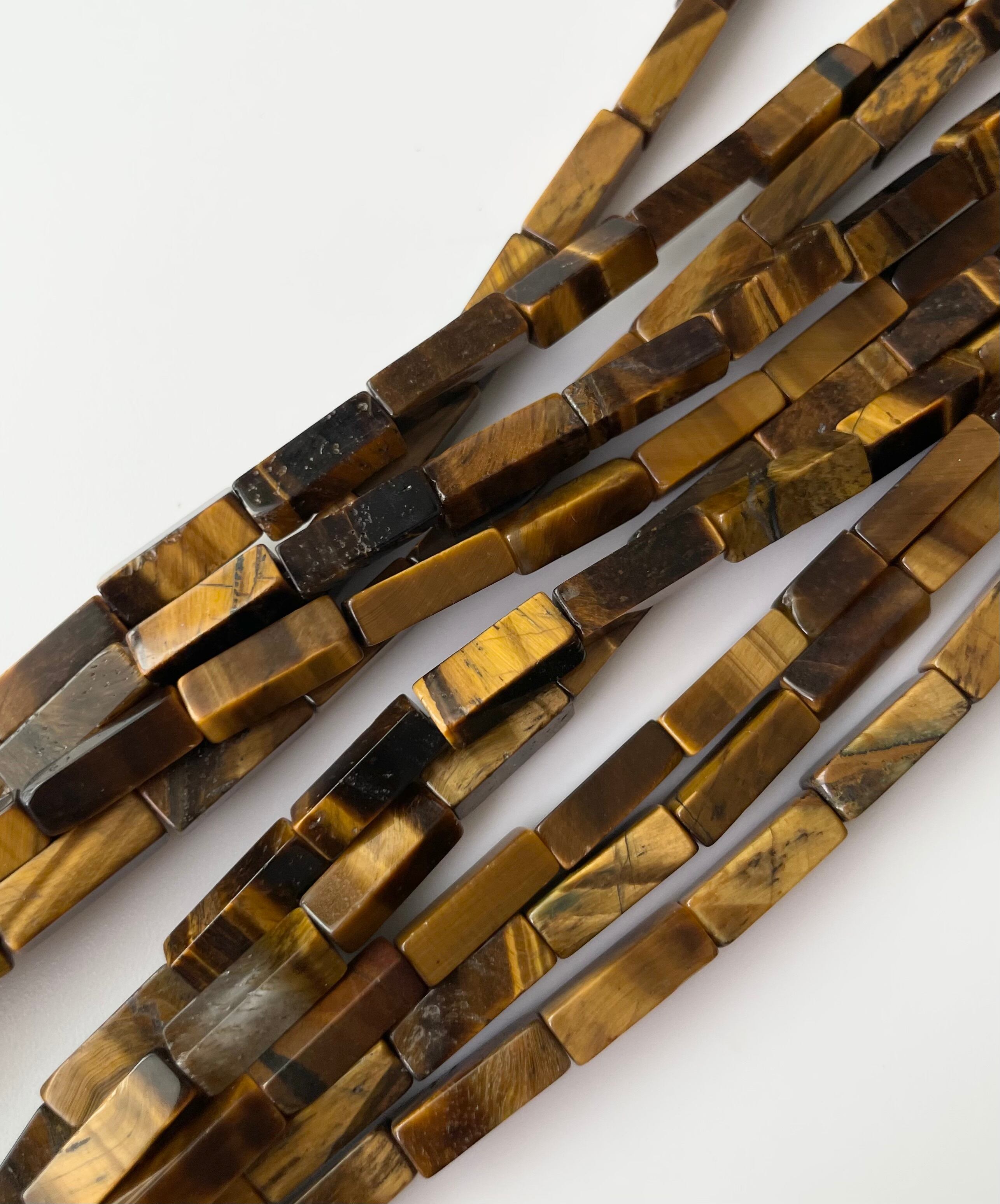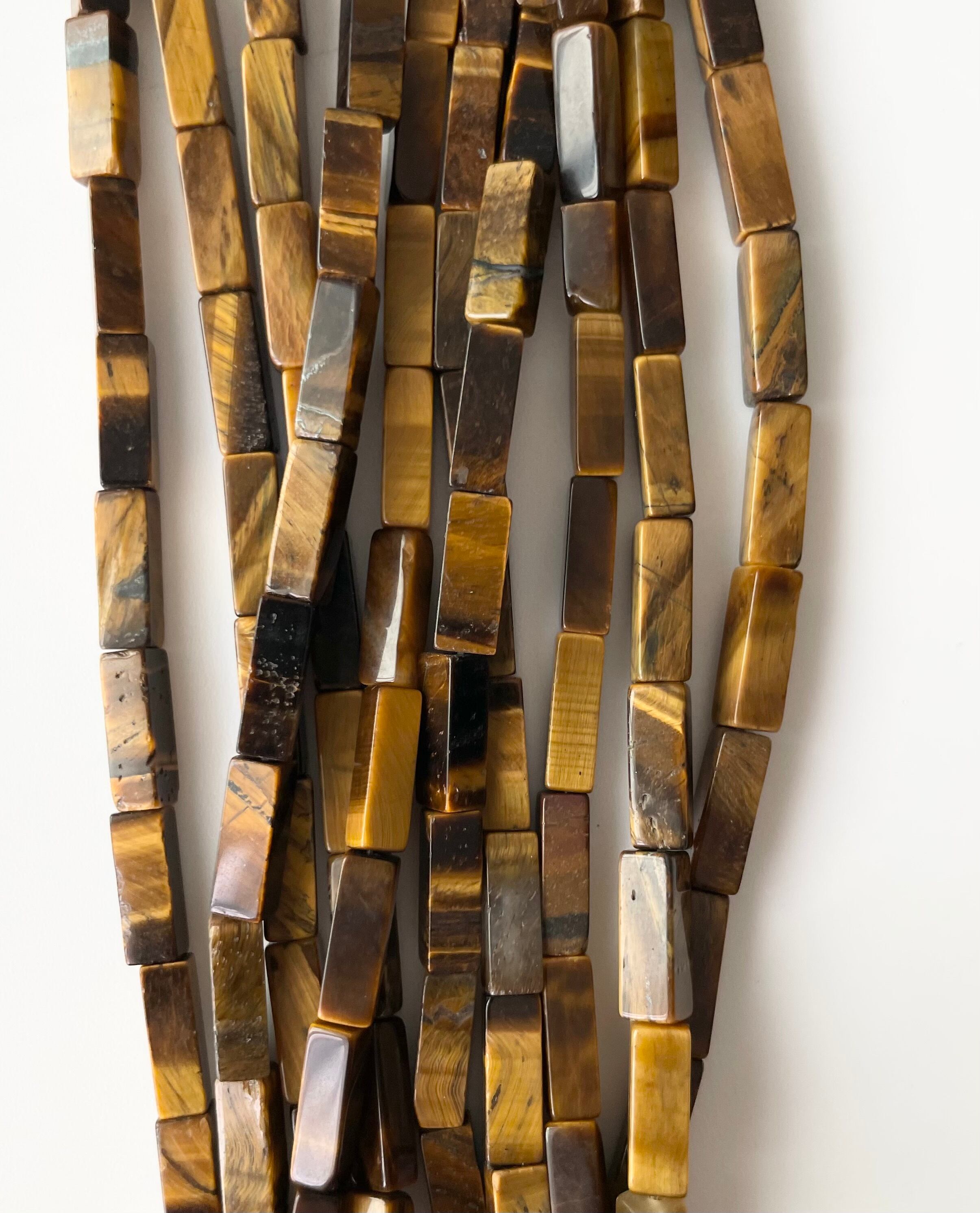 金褐色と焦げ茶色の縞模様が特徴的なタイガーアイを長方形チューブ型に加工した天然石ビーズ。光の筋が流れるように輝き、角度によって表情が変わります。落ち着きと華やかさを兼ね備えた色合いで、ユニセックスに使えるデザインです。