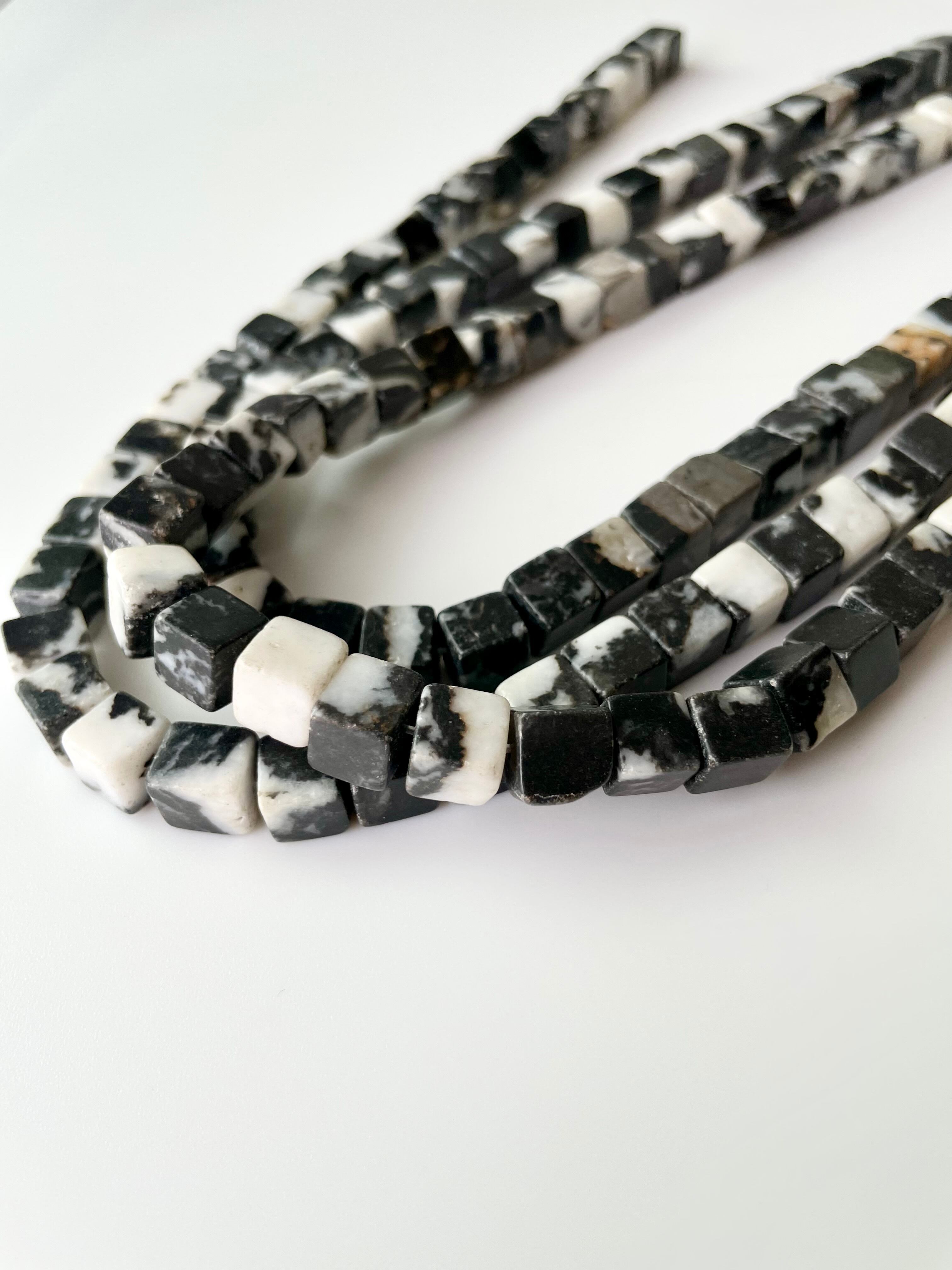 モノトーンの模様が印象的なゼブラストーンを、立体的なキューブ型にカットしたビーズをセレクトしました。